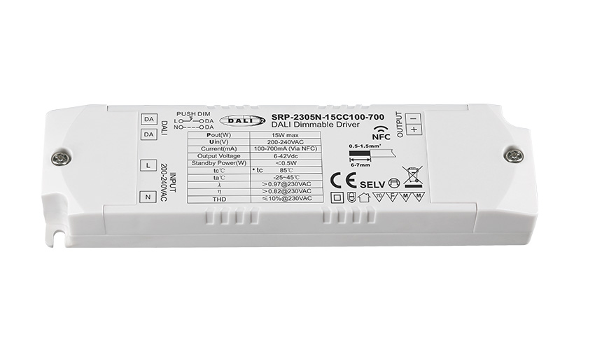 | DALI | 1通道 | 6-42V | 100-700mA via NFC setting; 最低設置電流檔位間隔低至 0.1mA,電流精度低至1% | 200-240VAC/ 176-280VDC | 最大15W | >0.96 | 135*35*20mm(長*寬*高) |