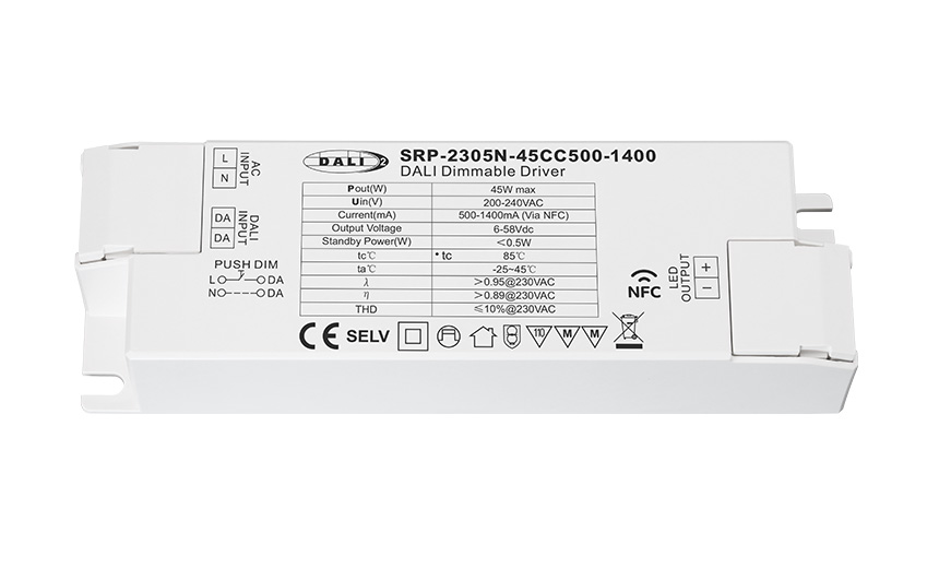 | DALI | 單通道 | 6-54V | 500-1400mA via NFC setting; 最低設置電流檔位間隔低至 0.1mA,電流精度低至1% | 200-240VAC/ 176-280VDC | 最大45W | >0.98 | 145*45*28mm(長*寬*高) |